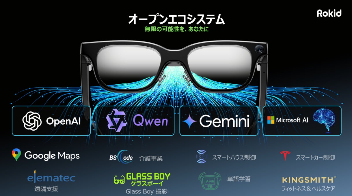 「Rokid スマートAIグラス」は、グローバルかつオープンなAI戦略のもと設計されており、特定サービスに固定されないマルチAIモデル対応と、GoogleマップやMicrosoft AI翻訳などのグローバルサービスをサポートしています。Rokid スマートAIグラスは、一般ユーザー向けの翻訳・撮影・AIアシスタント機能に加え、スマートフォン連携型の「CXR-M SDK」とグラス単体で動作する「CXR-S SDK」、さらにローコード/ノーコードでAIエージェントを構築できる「Rizon Platform」によるフルスタック開発環境を提供し、日本の開発者や企業がマルチモーダルな空間アプリケーションや業務向けソリューションを柔軟に開発・展開できるエコシステムの構築を推進してまいります。