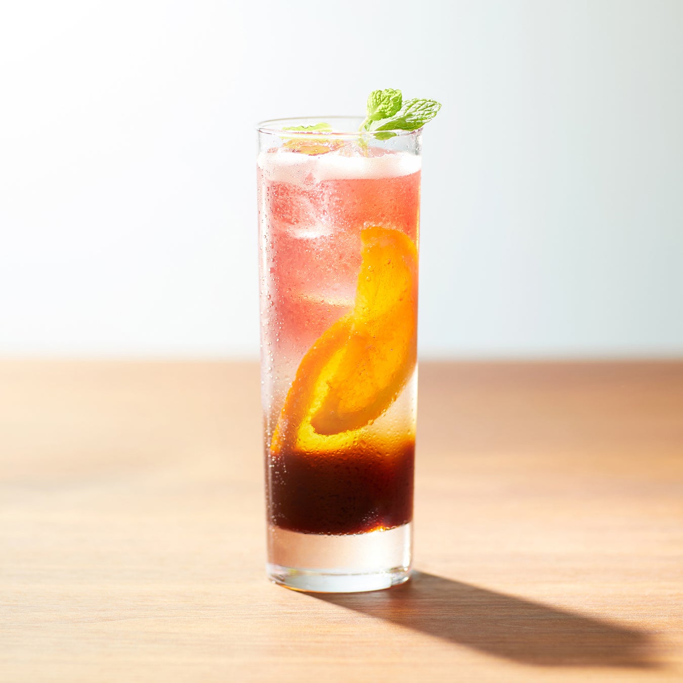 コールド ブリュー コーヒーの透明感のある味わい、オレンジの優しい甘み、仕上げに注ぐラズベリー ライムエードの甘酸っぱさを感じるビバレッジ。