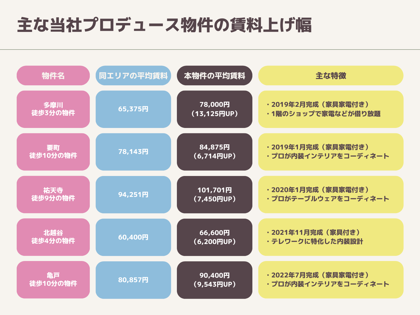 これまで当社がプロデュースした物件は、ほぼ全ての物件で付加価値創造による賃料向上を実現させてきました。