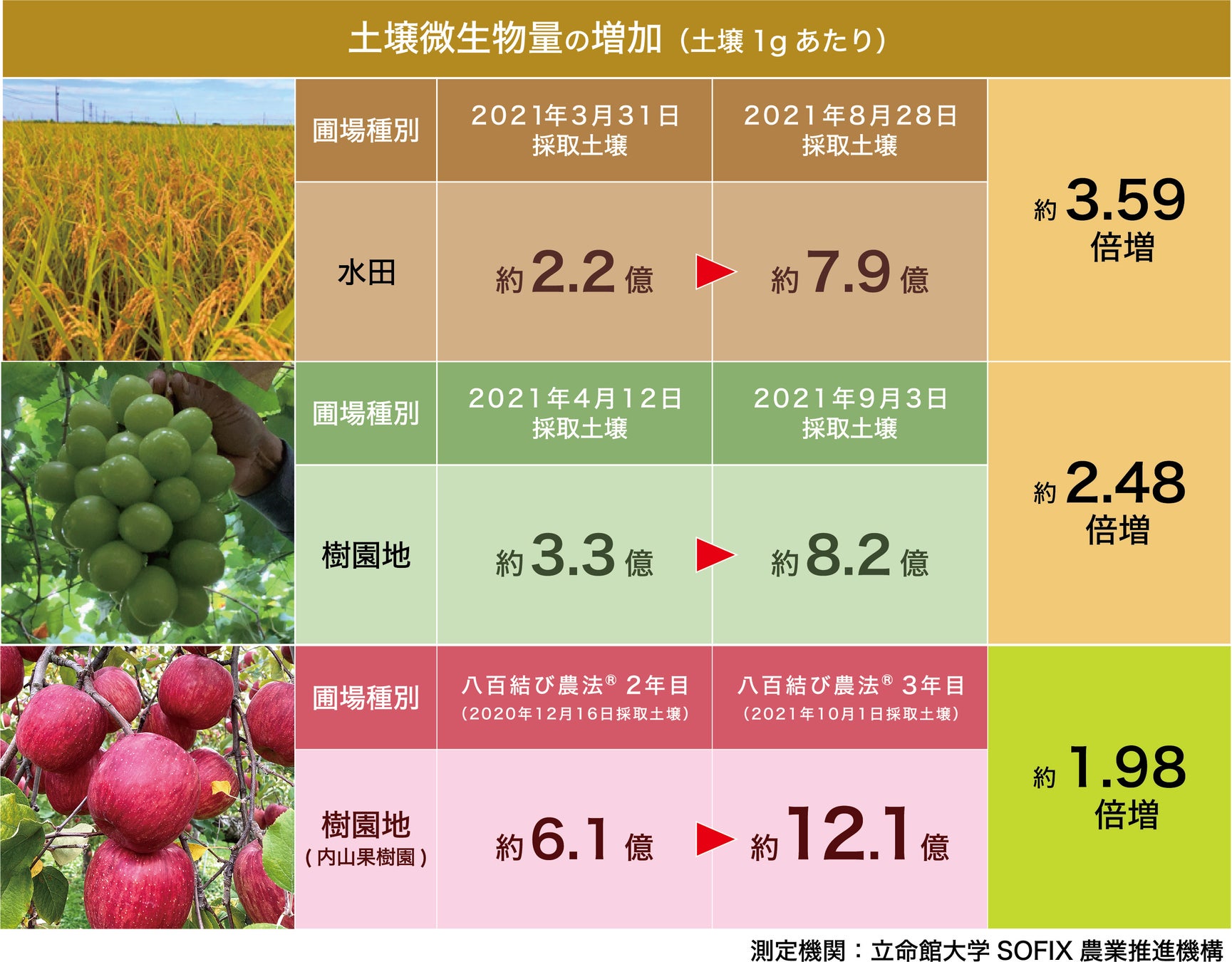 八百結び農法®実証実験(2021年度)では、富山県の水田(こしひかり)、山梨県の樹園地(シャインマスカット)の圃場(ほじょう)において双方共に約5ヶ月の短期間(八百結び農法®初年土壌)で、土壌微生物量がそれぞれ約3.59倍、約2.48倍の増加(2021年11月19日発表)が確認されています。また、「八百結びのりんご」生産者である青森県「内山果樹園」さまの“八百結び農法®3年土壌”においては、“1gあたり12.1億個”の土壌微生物量の活性が確認されており”2年土壌”からさらに倍増していることが、SOFIX農業推進機構の土壌診断*により判明しています(2021年12月13日発表)。