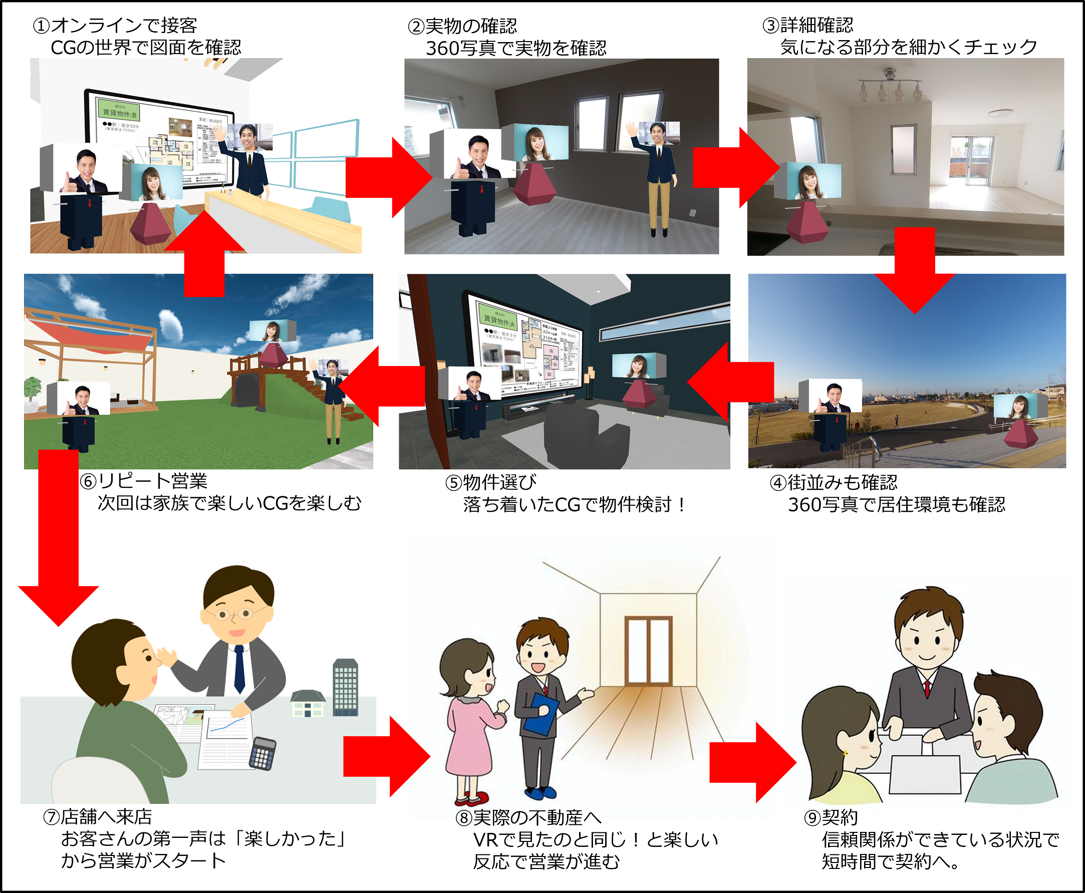 上記営業フロー図の⑥で、オンライン物件案内をしたにも関わらずご希望の物件が無かった方に対してVRのCG空間を楽しんでもらう時間をもうけました。その際に「次回は奥様やお子さんにもVRに入ってきていただき、再度新しい物件を案内させてください」と案内を実施。これにより、同じお客様に再度提案できる機会を作ることに成功。通常のオンライン営業や、VRの営業は正確に物件情報を伝える(リアリティー高く物件を感じてもらう)ために用いられていますが、メタバースでの営業は営業やコミュニケーションを楽しんでもらうことができ、結果として営業結果につながった。