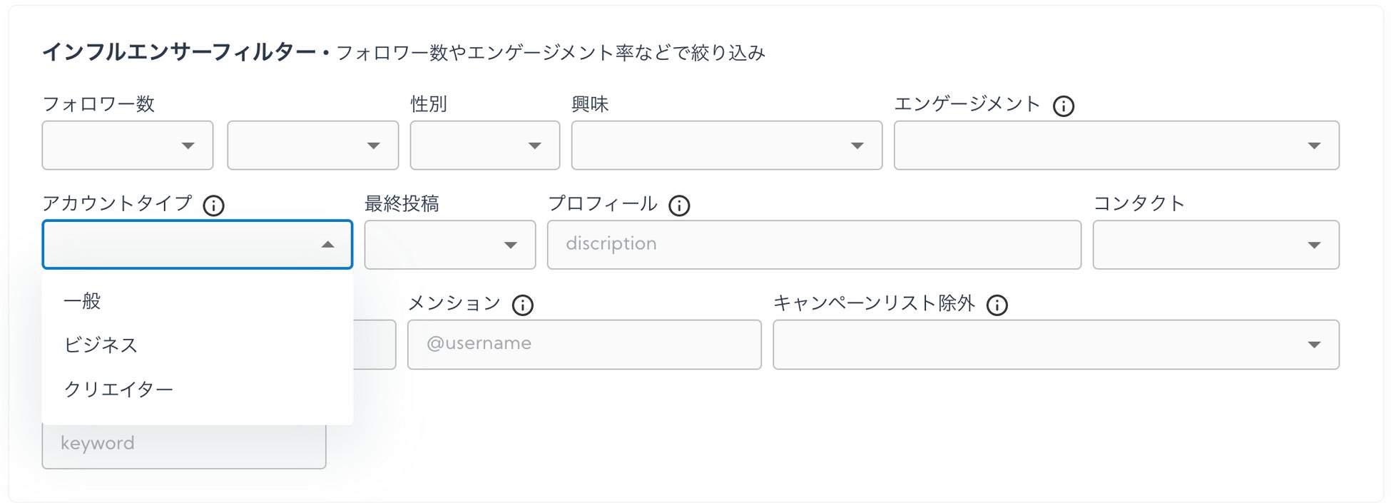 アカウントの種類を(一般、ビジネス、クリエイター)でインフルエンサーの検索をかけることができます。