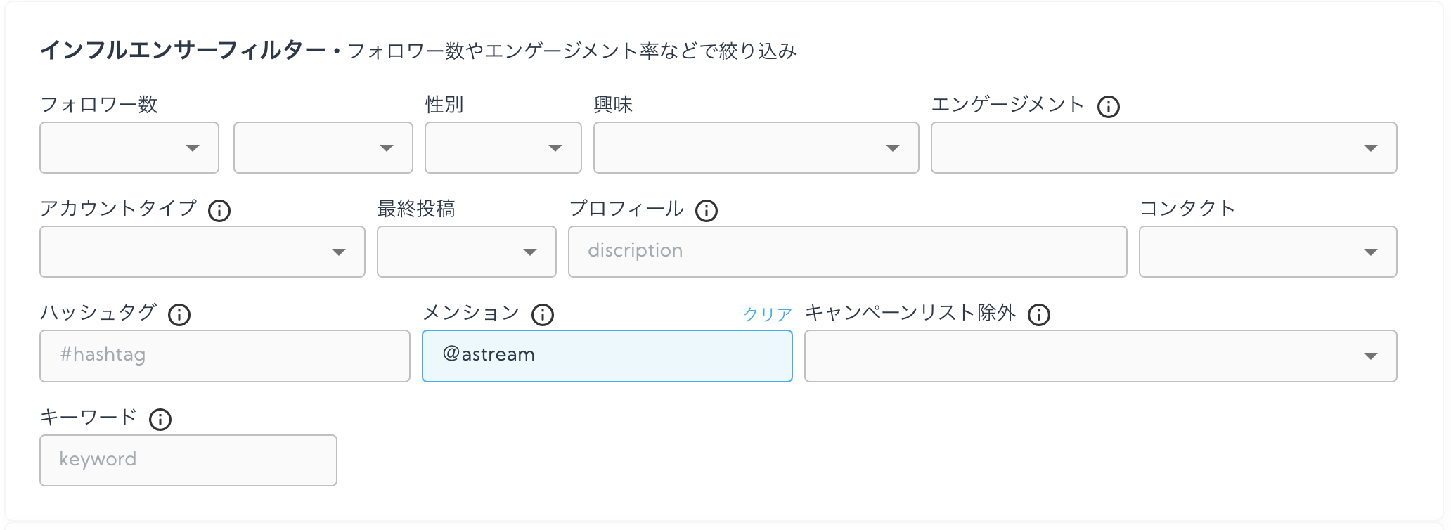 Astreamのアカウントリサーチ機能では、キーワード検索を搭載しています。YouTubeにおいて、動画内で発している音声、文章からキーワードを検索してインフルエンサーの発掘が可能です。