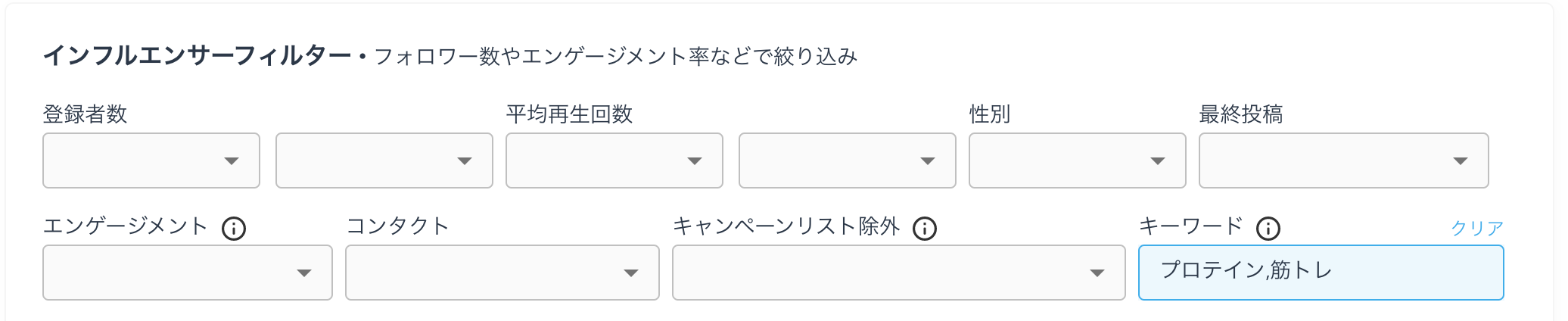 PR商材がプロテインだった場合に、キーワードで「プロテイン」「筋トレ」と検索をかけることで商材に関連したインフルエンサーが一覧で検索可能です。
