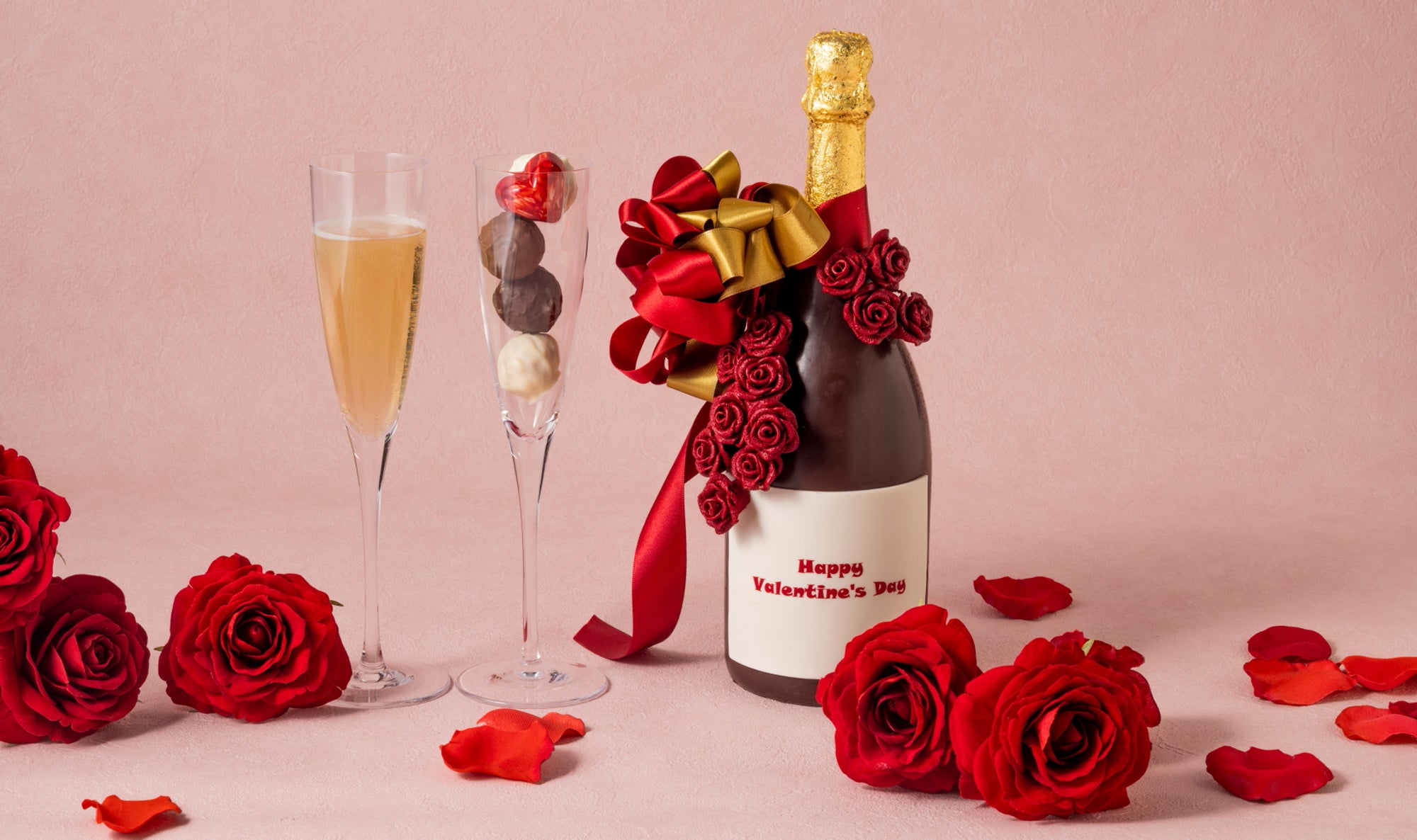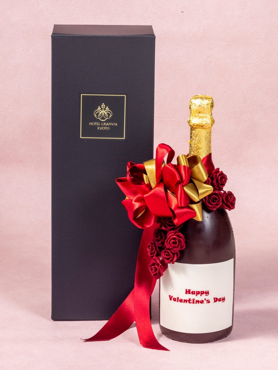 世界のトップ・パティシエたちが愛する最高品質のカカオを使用したフランスのヴァローナ社製チョコレートをふんだんに使い、1本1本型に流し込み一晩かけて形成したボトルには、チョコレートの花びらを重ねて作った真っ赤なローズでデコレーションを。さらに金箔をキャップシールに見立てた高級感を演出し、フォトジェニックに仕上げました。