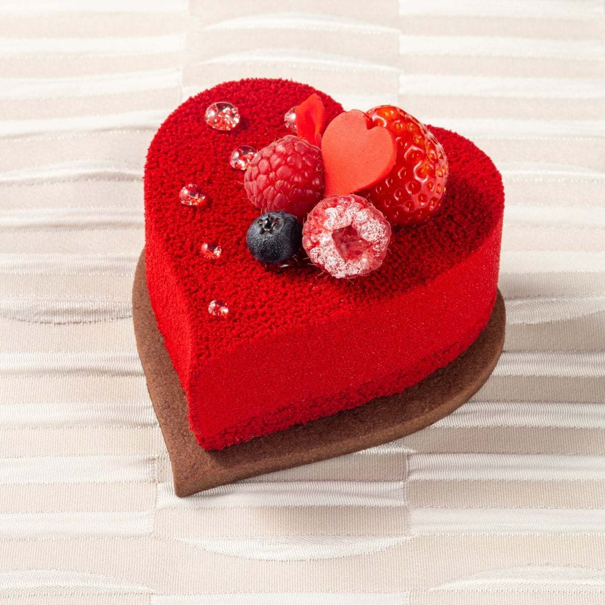 ハート型にベリーのあしらいが可愛い真っ赤なムースケーキが登場!ピスタチオクリームを忍ばせたチョコレートのムースを、サクッとした食感が味わえるショコラ風味のシュクレに重ねました。