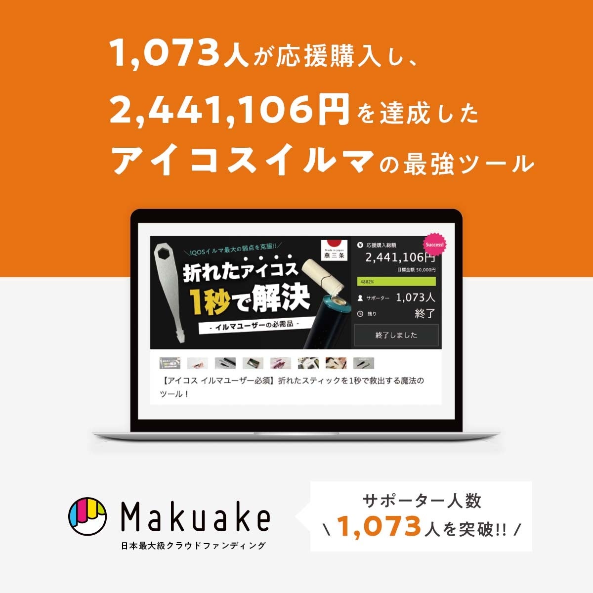 日本最大級のクラウドファンディングMakuakeにて、1073人が応援購入&達成率4,822%を記録。アイコスイルマ愛用者の悩みを解決する国産メタルガジェットとして、多くの方々から注目をいただきました。