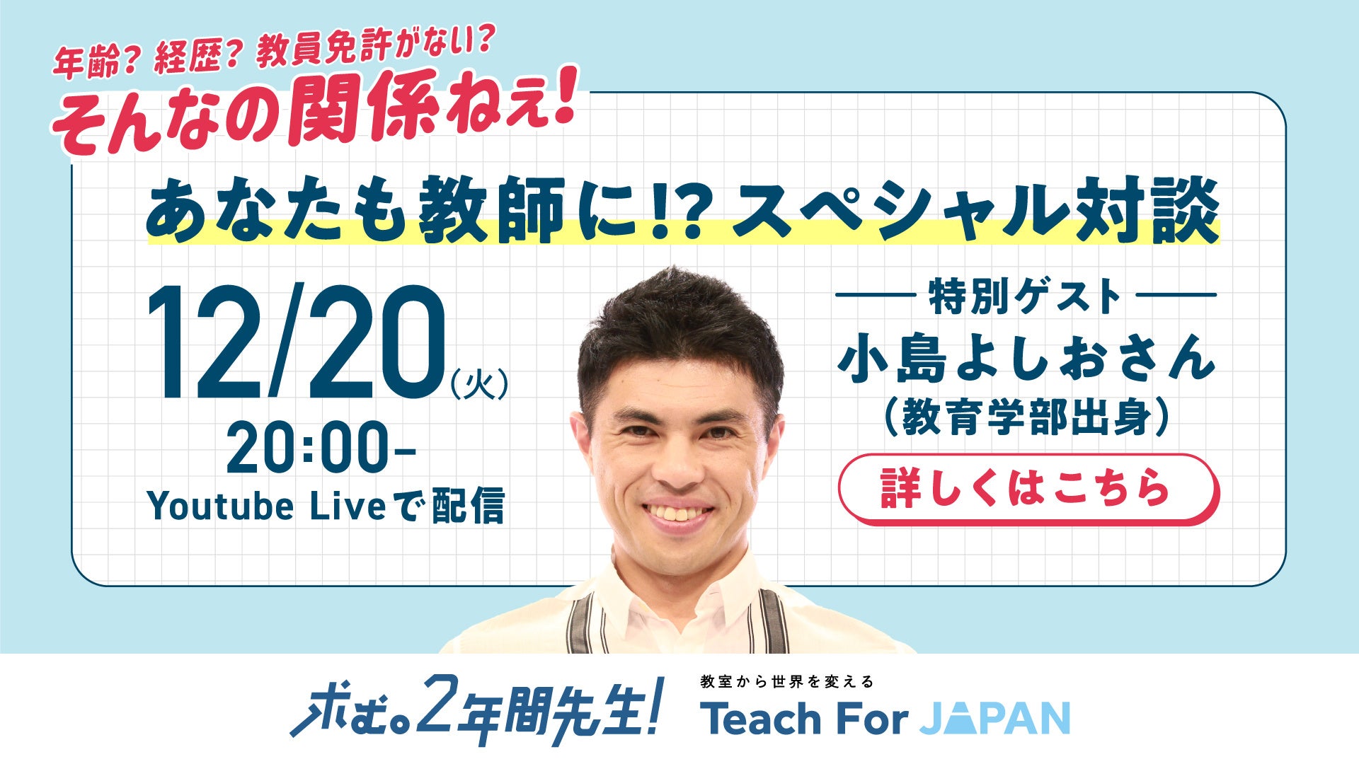 この度、TFJは「求む。2年間先生!」の新クリエイティブリリースを記念して、スペシャル対談イベントを開催。特別ゲストは、教育学部出身で小学生に大人気のお笑い芸人・小島よしおさんです。