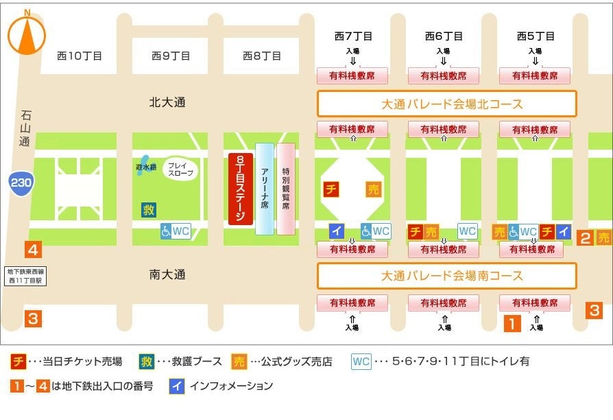- 大通パレード会場は例年と進行方向が逆向きになります(西7丁目から西5丁目に向かって進みます)