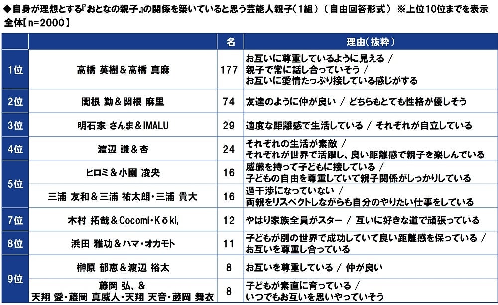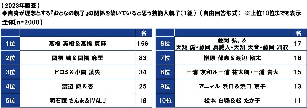 まず、全回答者(2,000名)に、自身が理想とする『おとなの親子』の関係を築いていると思う芸能人親子(1組)を聞いたところ、テレビ番組やイベントなどで度々親子のエピソードを披露している「高橋 英樹さん&高橋 真麻さん」が1位となり、2位「関根 勤さん&関根 麻里さん」、3位「明石家 さんまさん&IMALUさん」、4位「渡辺 謙さん&杏さん」、5位「ヒロミさん&小園 凌央さん」と続きました。