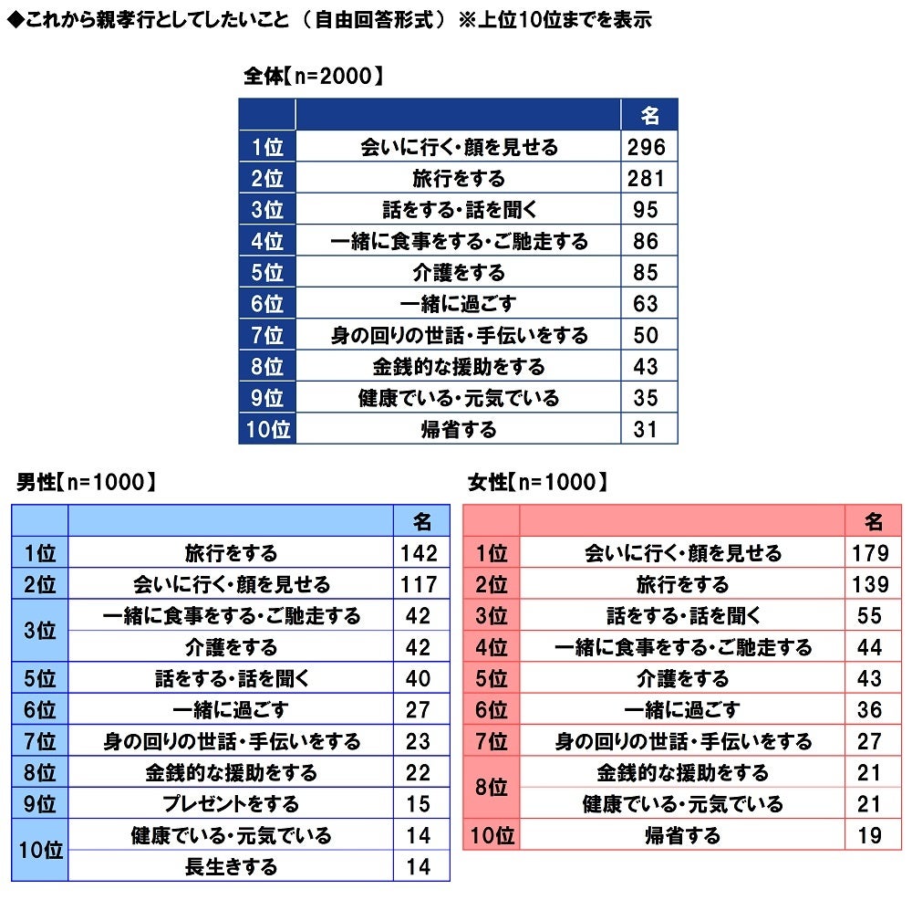 男女別にみると、男性では1位「旅行をする」、2位「会いに行く・顔を見せる」、3位「一緒に食事をする・ご馳走する」「介護をする」となりました。