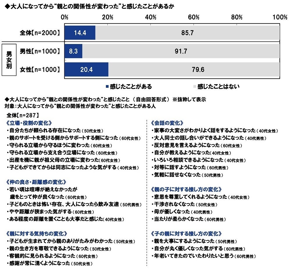 大人になってから“親との関係性が変わった”と感じたことがある人に、どのように変わったかを聞いたところ、「自分たちが頼られる存在になった」「親のサポートを受ける側からサポートする側になった」「守られる立場から支え合う立場になった」「やや距離が狭まった気がする」「親の生き方を尊敬できるようになった」「大人同士の話し合いができるようになった」「いろいろ相談できるようになった」といった回答がみられました。精神的距離感の変化や、相互扶助の関係への変化、親に対する感謝や尊敬の気持ちの高まりなどは、おとなの親子という関係性を表わす特徴的な変化ではないでしょうか。