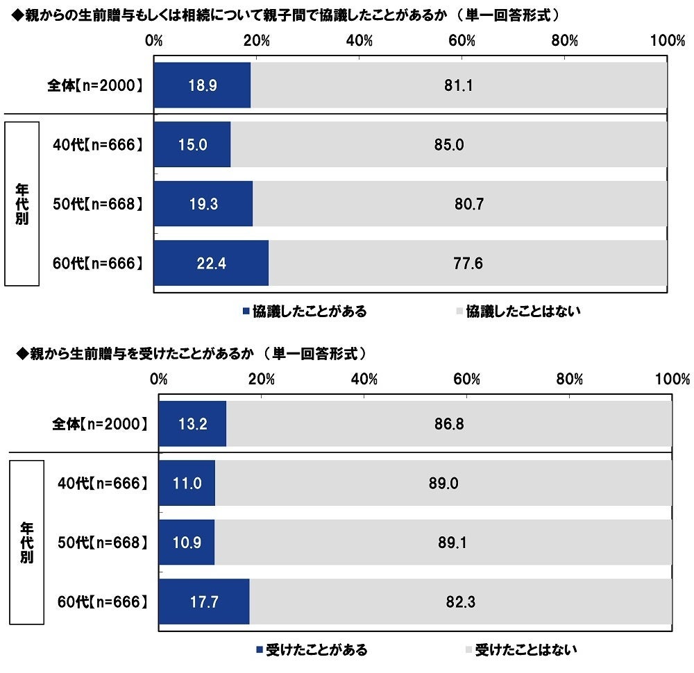 70歳以上の実の親がいる40~69歳の男女2,000名(全回答者)に、親からの生前贈与もしくは相続について親子間で協議したことがあるかを聞いたところ、「協議したことがある」は18.9%、「協議したことはない」は81.1%となりました。