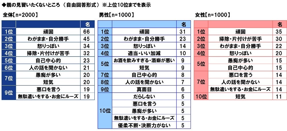 他方、親の見習いたくないところを聞いたところ、1位「頑固」、2位「わがまま・自分勝手」、3位「怒りっぽい」、4位「掃除・片付けが苦手」、5位「自己中心的」となりました。