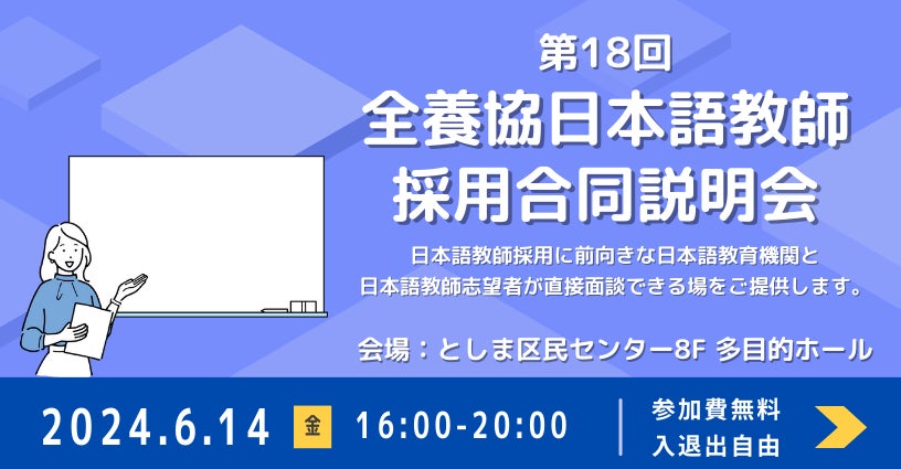 2024年6月14日(金)東京・池袋にて、「第18回全養協日本語教師採用合同説明会」(主催:一般社団法人全国日本語教師養成協議会)を開催します。採用に積極的な日本語教育機関のほか、独立行政法人国際交流基金、独立行政法人国際協力機構(JICA)も出展します。