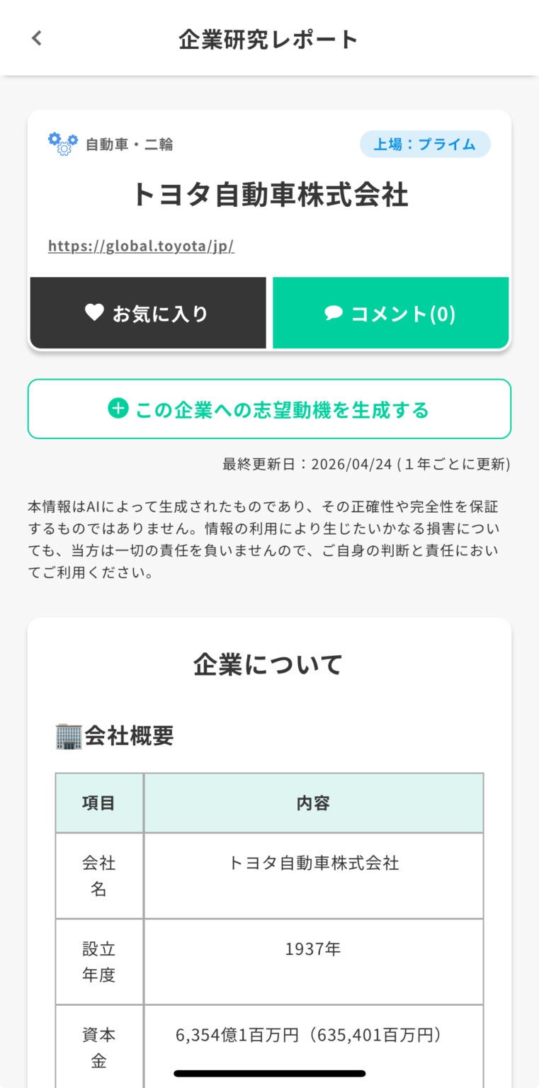 企業名と公式サイトURLを入力するだけで、AIがその企業の事業内容や特徴を自動で調査・整理し、詳細な企業研究レポートを生成します。
