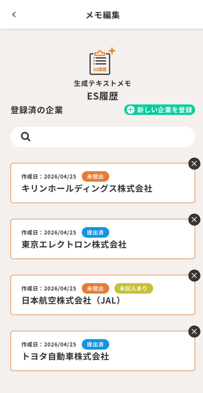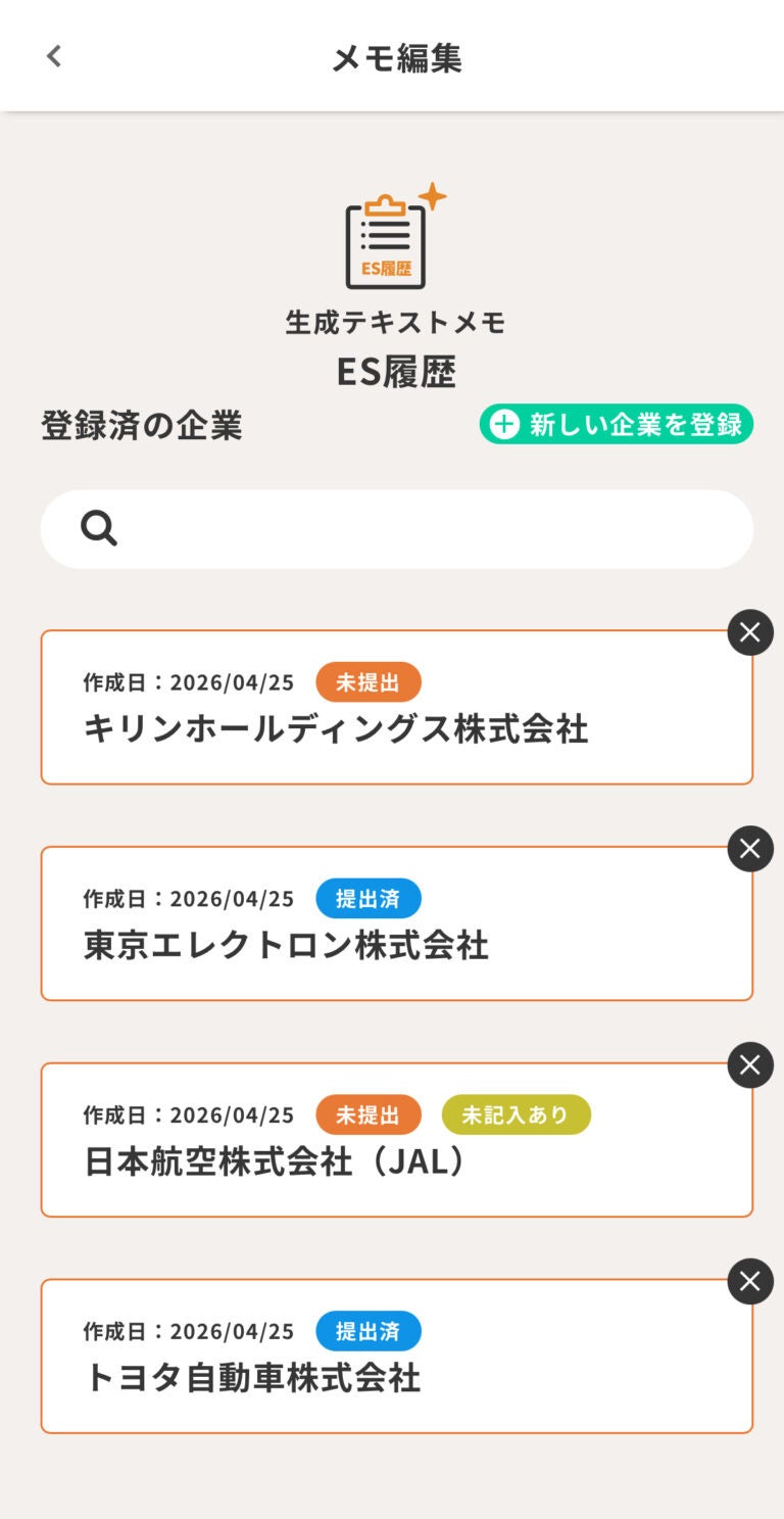 さらに、作成・提出済みテキストを一元管理するES履歴機能も強化しました。