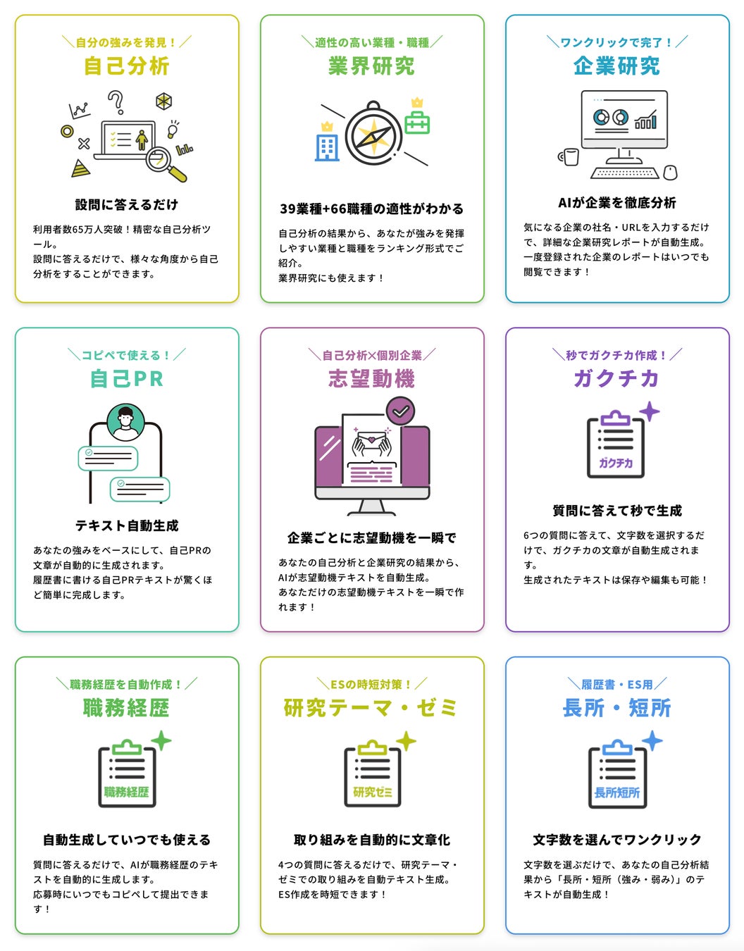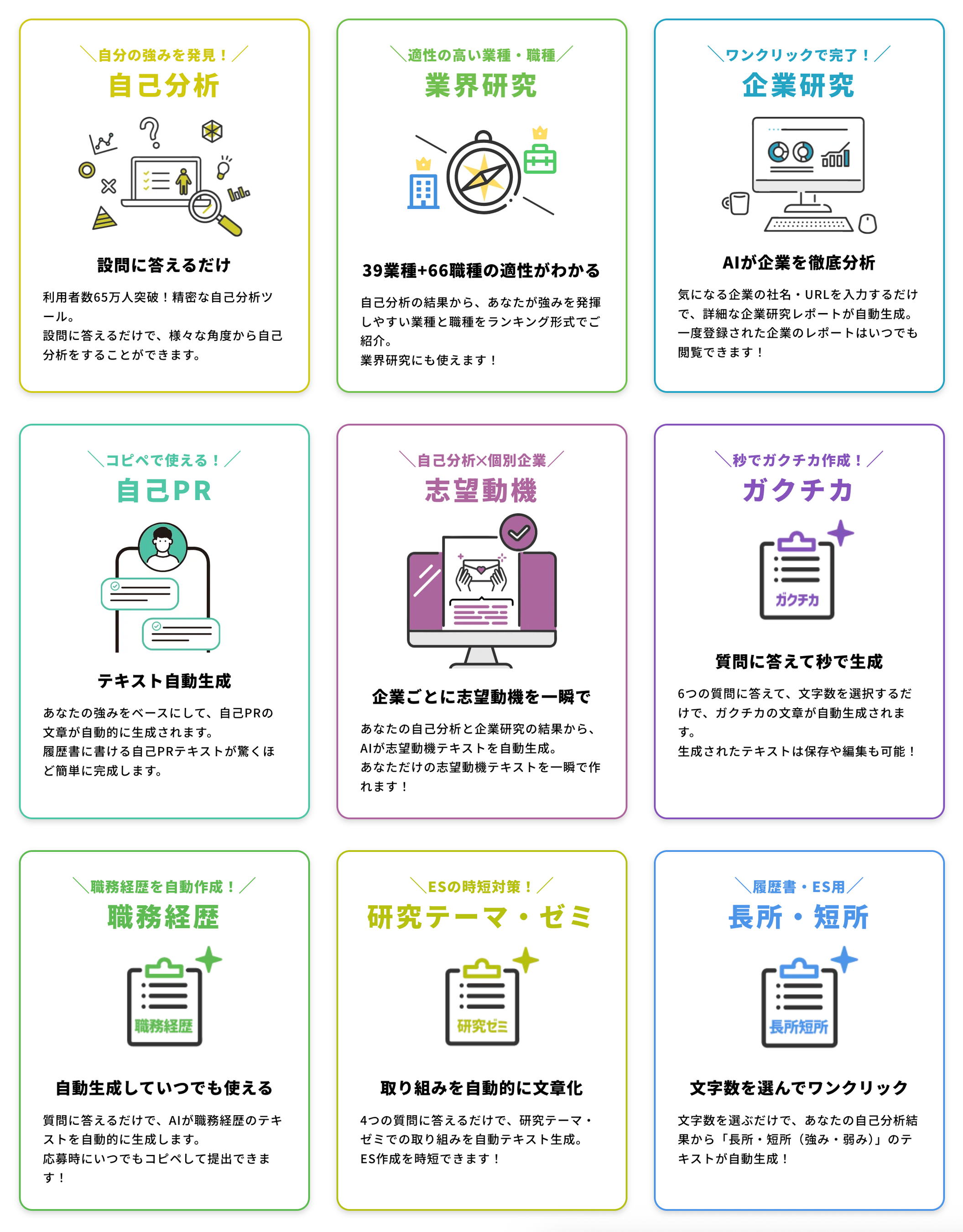 求職者向け:自己分析、企業研究、志望動機・自己PR・ガクチカ・職務経歴の自動生成、ES履歴管理、業界研究などをワンストップで提供
