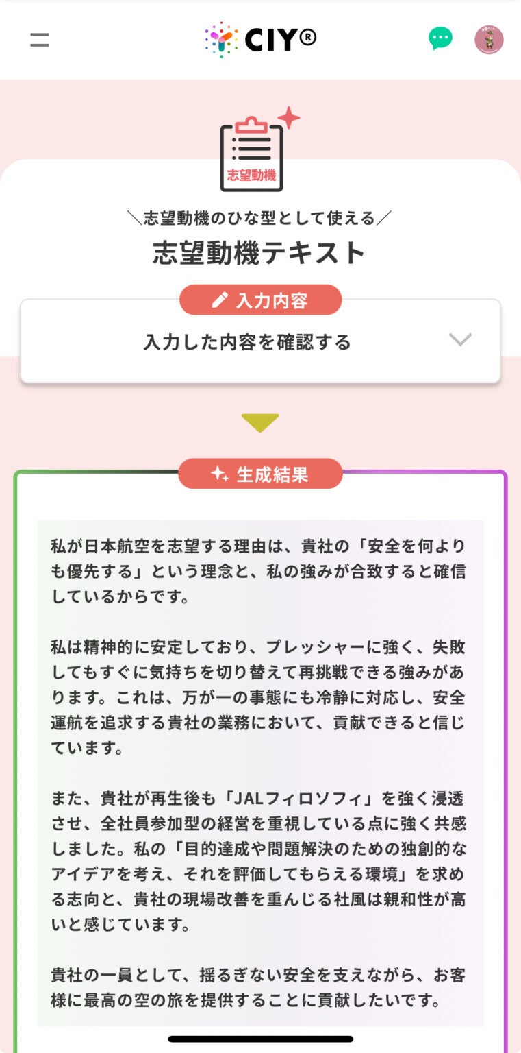 本サービスでは、AIが企業研究を自動で実施し、累計65万人以上が利用するCIYの特許取得済み独自アセスメント技術※による自己分析データと組み合わせることで、応募企業ごとに最適化された志望動機・自己PR・ガクチカ・職務経歴などの応募書類テキストを自動生成する機能群を新たに搭載。