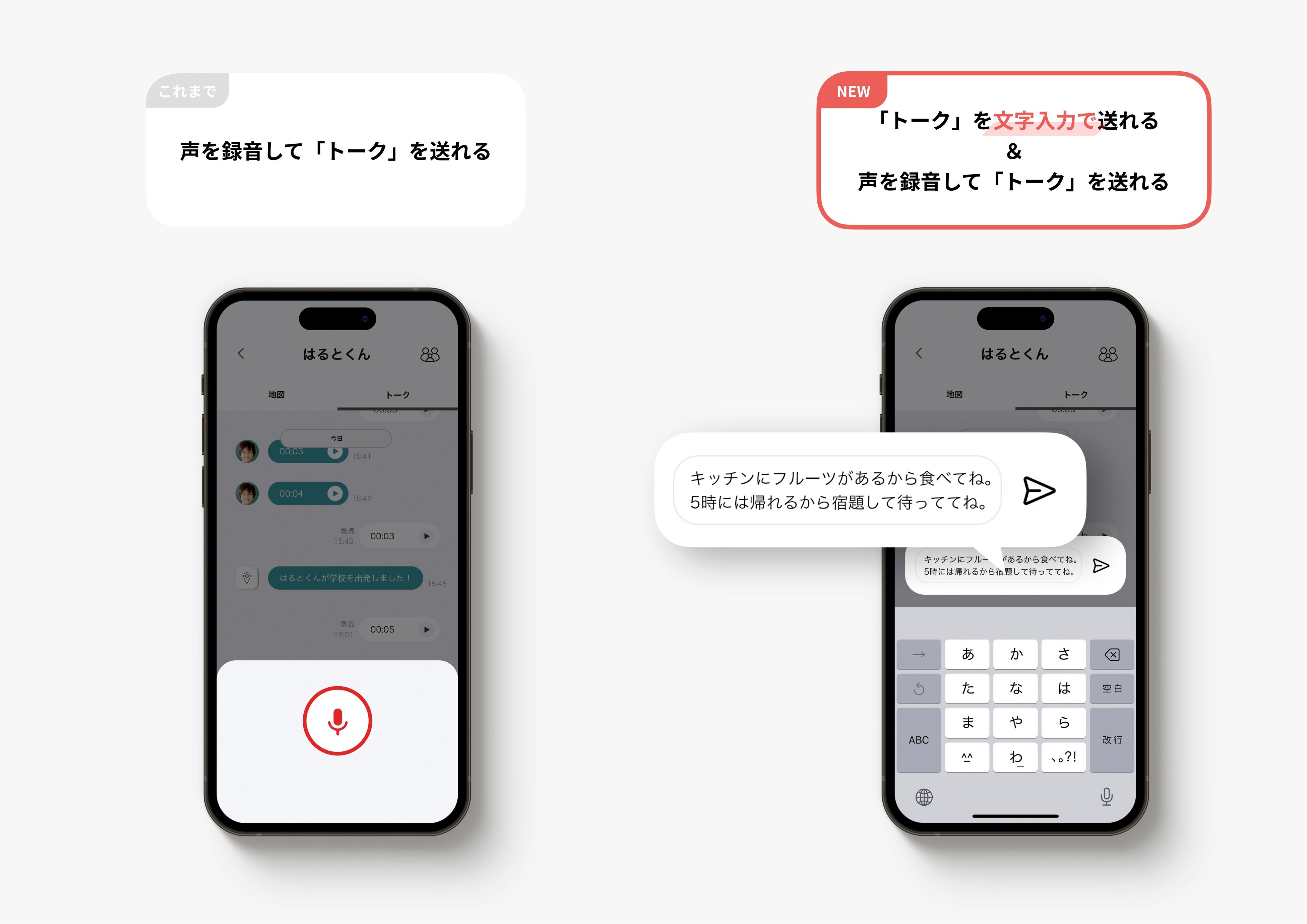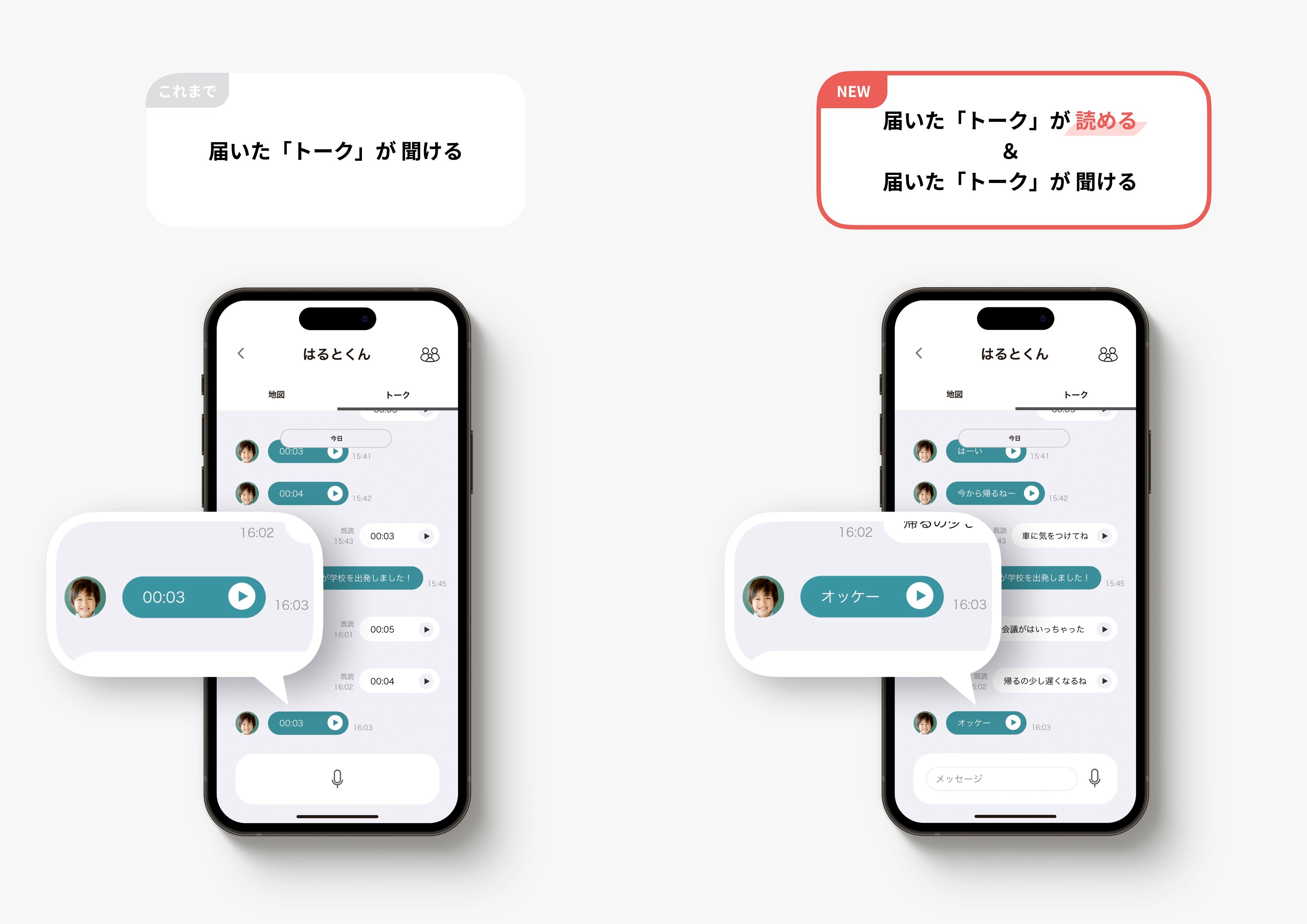 保護者のスマホアプリに届く子どもの声(トーク)を、音声AIが代わりに書き起こすことで、保護者は、アプリ上でトークを再生できることに加え、トーク内容を「読む」ことも出来るようになります。さらに、保護者がアプリで入力したテキストを音声AIが代読し、音声として送信することもできるようになります。結果、トークの録音や再生ができない場面であっても、より自由にトークを送り合えるようになるため、これまで以上に多様な親子のコミュニケーションをサポートできるようになります。