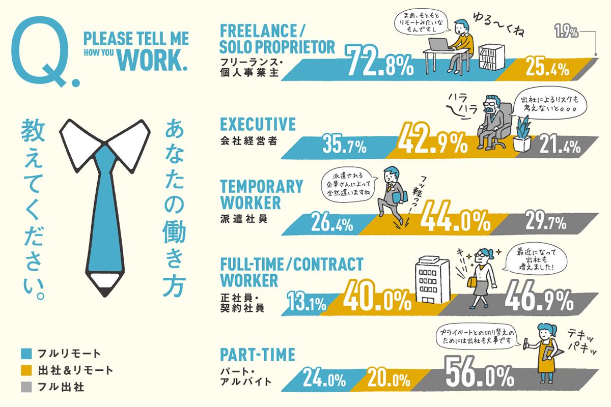 最もリモート化が促進されている雇用形態かと思いきや、意外にも現在も【フル出社】が約半数を占めるという結果になりました。