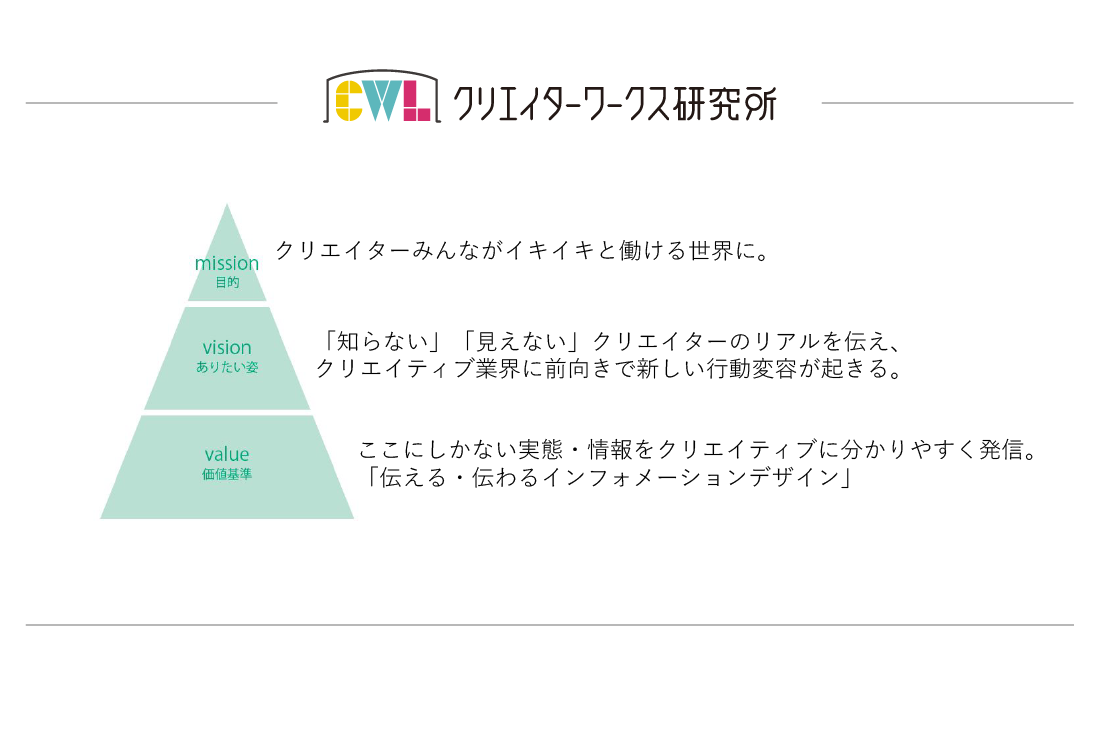 そのミッションを叶えるべく、『「知らない」「見えない」クリエイターのリアルを伝え、クリエイティブ業界に前向きで新しい行動変容が起こす』ことをビジョンとしています。