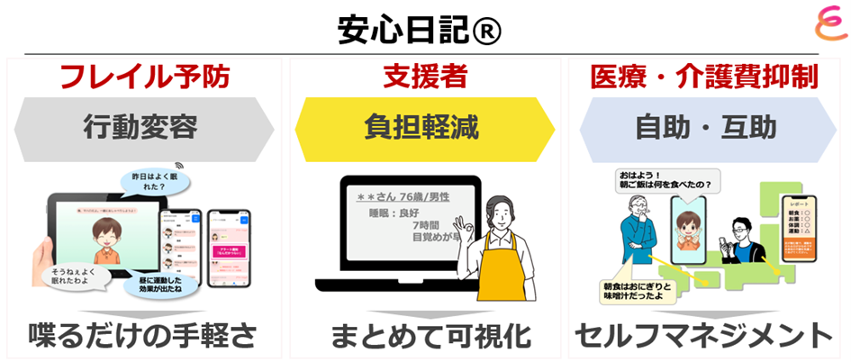 本業務提携により、対話AIアプリ「安心日記®︎」の開発・実証をさらに加速し、日本の社会課題の一つであるフレイル・プレフレイル対象者1,800万人の予防・改善を支援してまいります。また、両社が保有する技術、リソース、導入拡大ノウハウを組み合わせることにより、自治体・官公庁のみならず、民間会社を含めたDXの促進、ならびに「デジタルヘルス」「フレイル予防」分野におけるソリューション開発、サービス導入拡大を共同で進めてまいります。