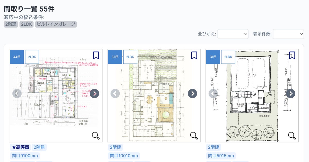 お客様の要望やこだわりポイントだけでなく、土地の広さや地型に合致する間取りを4,800枚/19,200パターン(2024/05/17現在)からクイックに検索、お客様のご要望やご予算に合わせて複数の間取りをご提案いただくことができます。