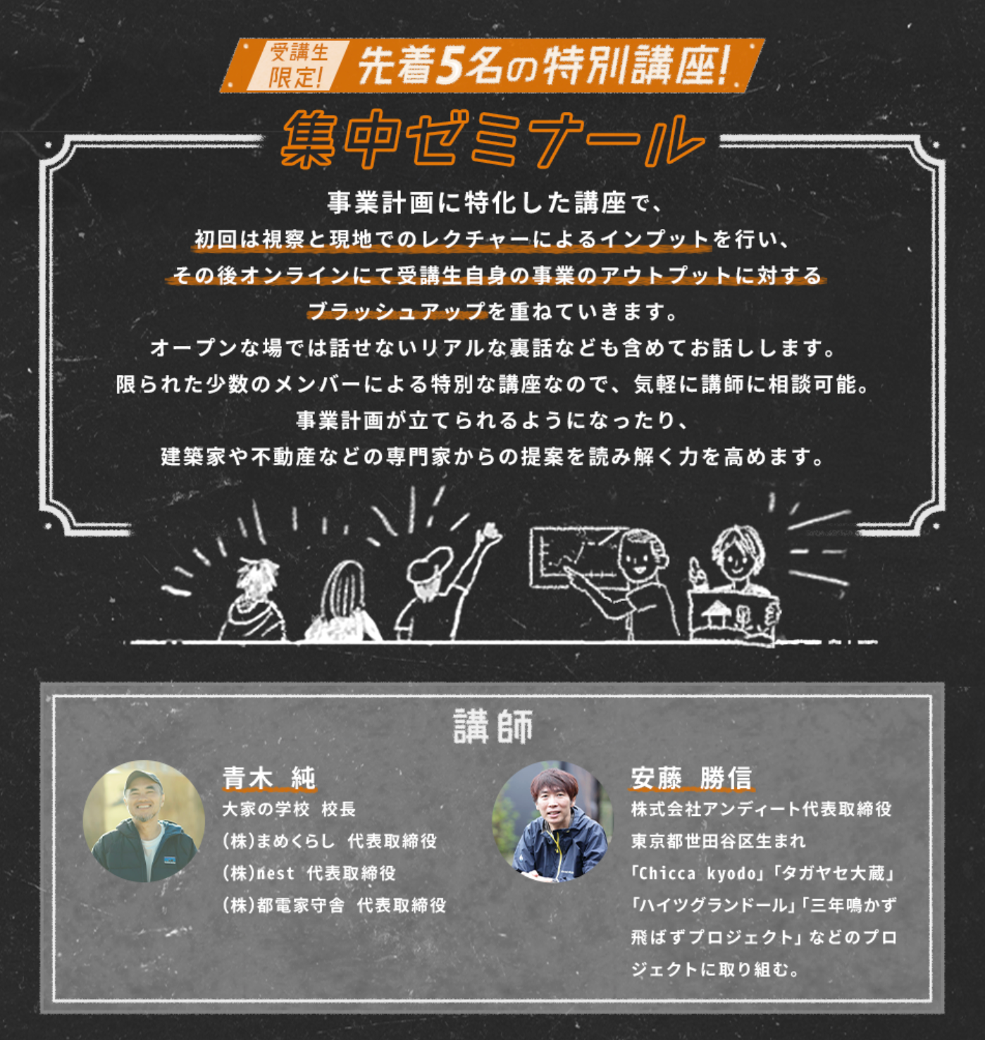 初回は視察と現地でのレクチャーによるインプットを行い、その後はオンラインにて受講生自身の事業のアウトプットに対するブラッシュアップを重ねていく、事業計画に特化した特別講座「集中ゼミナール」を開催します。先着5名の少人数制の講座です。講師は、大家の学校 校長の青木純。そして、古い建物を新たな価値ある場に再生し、住まい手の愛着や地域のつながりを育んでいる、株式会社アンディート代表取締役の安藤勝信氏が務めます。初回の視察では、安藤氏が拠点とする世田谷・経堂などでの視察を行います。限られた少数のメンバーによる特別な講座なので、オープンな場では話せないリアルな裏話なども含めてお話しします。気軽に講師への相談も可能です。自身の取り組みのコンセプトや強みを明確にし、事業計画を立てられるようになったり、建築家や不動産などの専門家からの提案を読み解く力を高めます。