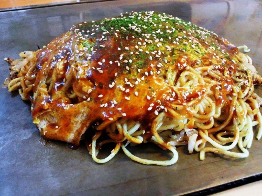 キャベツたっぷり重ね焼き。甘いソースが食欲そそる!鉄板でアツアツをご提供。本場広島のお好み焼きご堪能あれ!