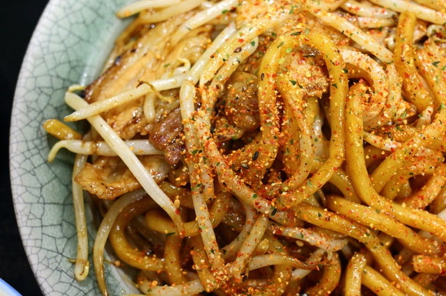 食べ応えと腹持ちを良くする極太麺と、うまみたっぷりの濃厚ソース、そして豚肉ともやしのシンプルな具。一味唐辛子を振りかけるのも通。