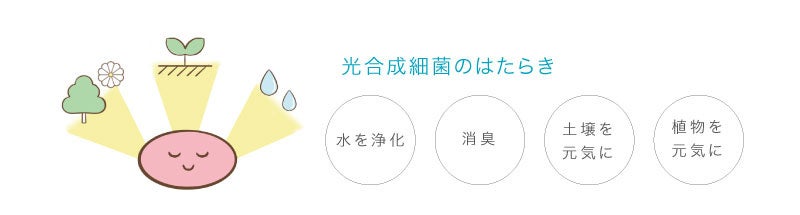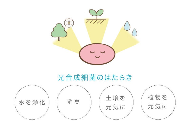 光合成細菌は、水田や河川、池などに分布し、水質の浄化や豊かな土壌づくりに力を発揮する、人にとって良い働きをしてくれる微生物です。排水とともに流したり、土にまくことで水質の浄化、消臭、土壌の肥沃化などに働きます。イービーエムのスキンケアスタジオで排水の浄化に使用するとともに、お客様にも生活の中でご活用いただけるよう、MIRAIWA+ 腸内フローラ解析キットへ光合成細菌のミニボトルを同梱しています。