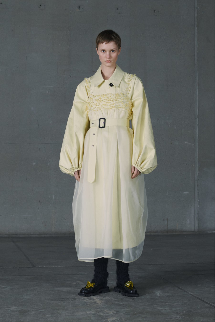 今シーズンのCECILIE BAHNSEN(セシリー・バンセン)は街の暗い夜を通り抜け、柔らかな朝の光に向かう少女たちをイマジネーション。コレクションは、デザイナーのCecilieがパリファッションウィークのために制作したムービーの4つの章を反映して、4つのカラーストーリーで描かれます。カラーパレットは、グレー、黒、青を織り交ぜ、オレンジ色の刺繡の輝きを放つ淡いレモンになり、暗闇から光へと移動していきます。 MACKINTOSHとCECILIE BAHNSENのコラボレーションは、北欧の冬の光に触発された上記の色合いのコートで発表されました。Cecilieは、伝統的なアノラックを、ボリュームのあるパフスリーブのロマンチックなシルエットに変え、デザイン。シングルコートはマッキントッシュのトレードマークであるゴム引きコットンで提案されます。 このコラボレーションピースは、2021年12月14日(火)よりDOVER STREET MARKET GINZAにて展開予定です。