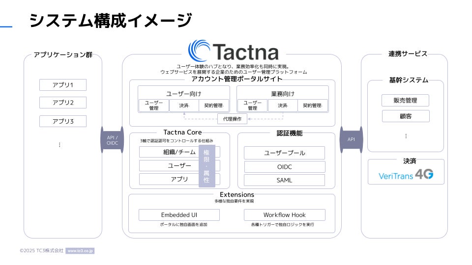 TC3 は、Tactna を通じてエンタープライズ企業のデジタルサービス展開を支援し、信頼性と柔軟性に富んだ ID管理を実現することで、企業の成長と顧客満足度向上に貢献してまいります。詳細は当社ウェブサイトの特設ページをご確認ください。