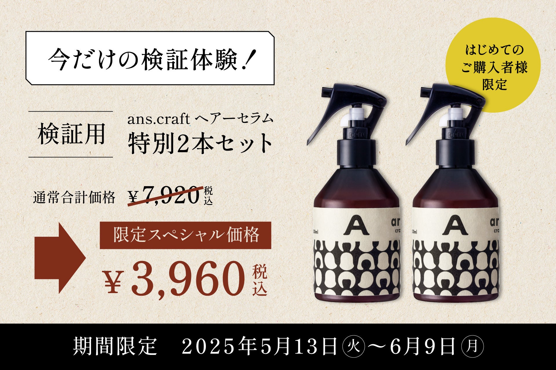期間中、キャンペーンページにて、はじめてご購入のお客様に限り「ans.craft ヘアーセラム」2本セット(通常合計価格7,920円/税込)が、【特別価格】3,960円(税込)でお買い求めいただけます。