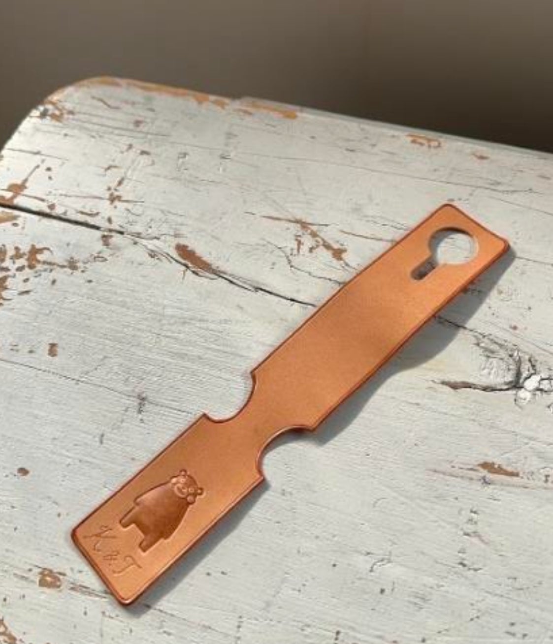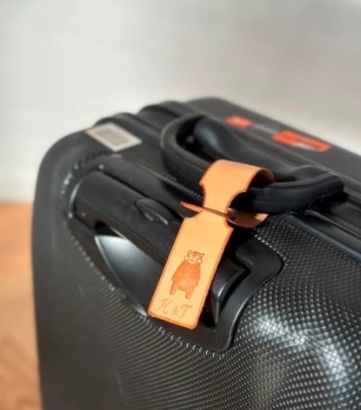 ヌメ革にくまモンが焼き印されたラゲージタグにイニシャルや文字を入れていただきます。