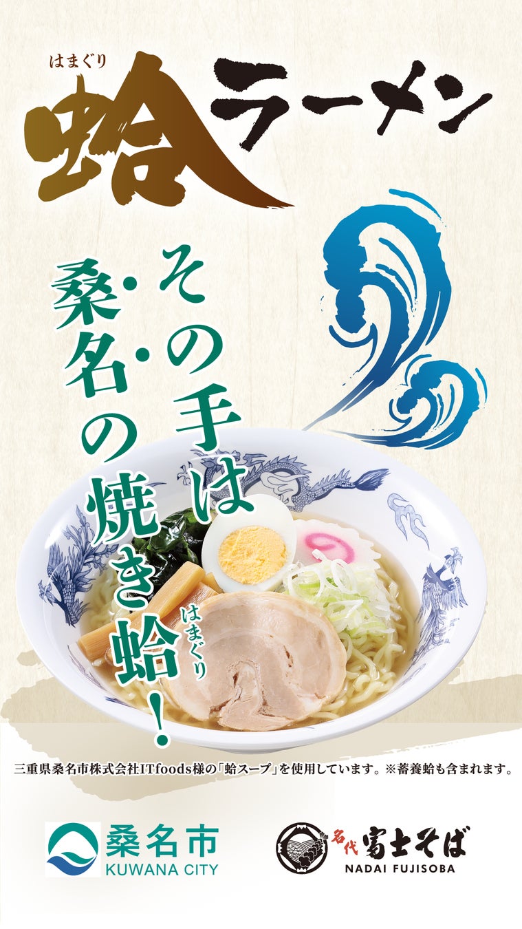この度、関東地域で広く事業展開をされている名代富士そば様と三重県桑名市の名産であります蛤のコラボが「蛤ラーメン」という形で実現しました。