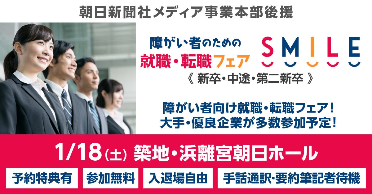 ≪朝日新聞社メディア事業本部後援≫1/18(土)東京・築地にて開催!障がい者のための就職・転職フェアSMILE【2026/2025新卒・第2新卒・中途対象】大手優良企業が参加