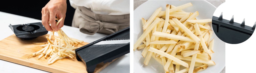 食材が均一な厚さでスライスできるので、食感や火入れのバラつきが抑えられます。また、食材の形をそのまま生かした料理が手軽に楽しめます。