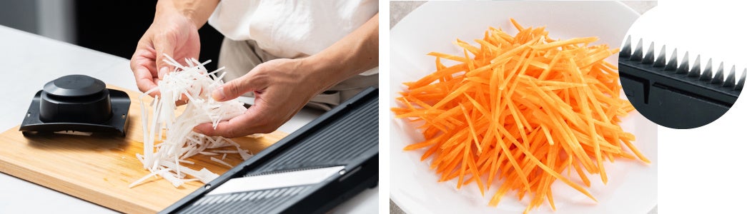 大根や人参などの千切りが手軽にできます。きんぴらやサラダづくりに重宝します。