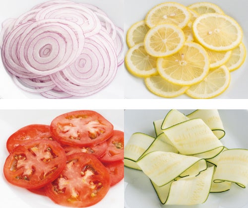 スライス刃の調理例 包丁では難しい薄くて均一なスライスができます。極薄のオニオンスライスやレモンの輪切りも簡単にできます。崩れやすいトマト、ズッキーニを長くリボンのようにスライスできます。