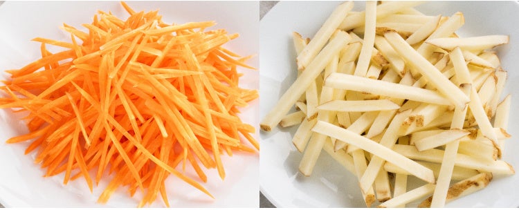 千切り刃の調理例 千切り刃を使えば、均一な幅で細切りできます。