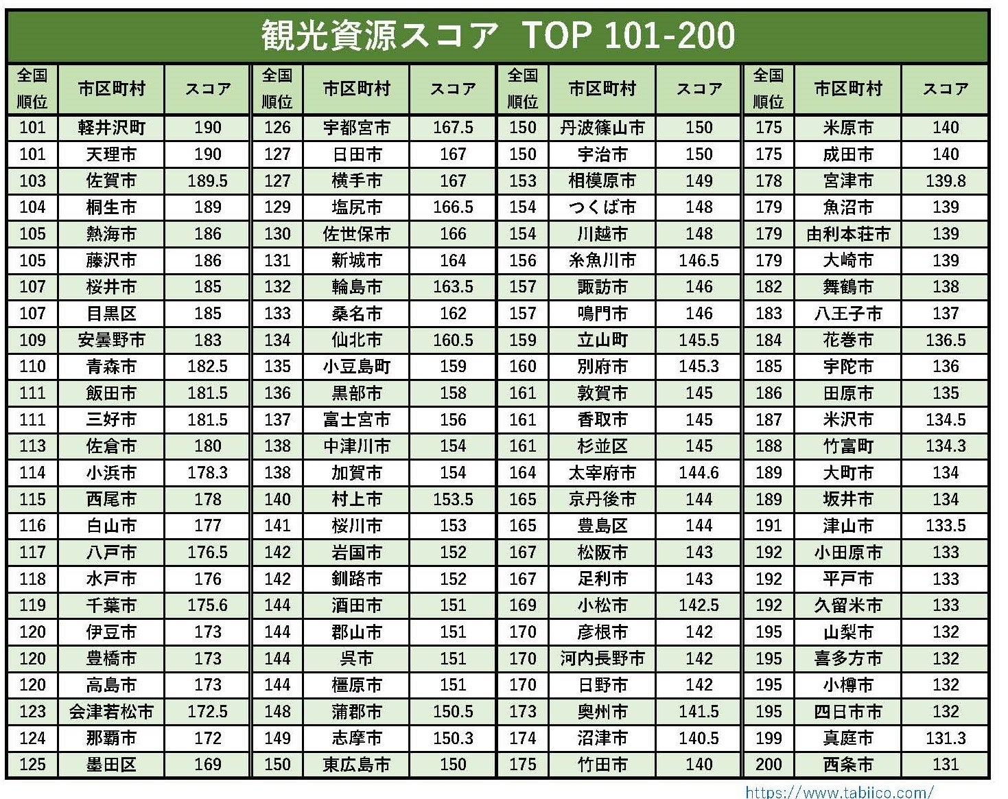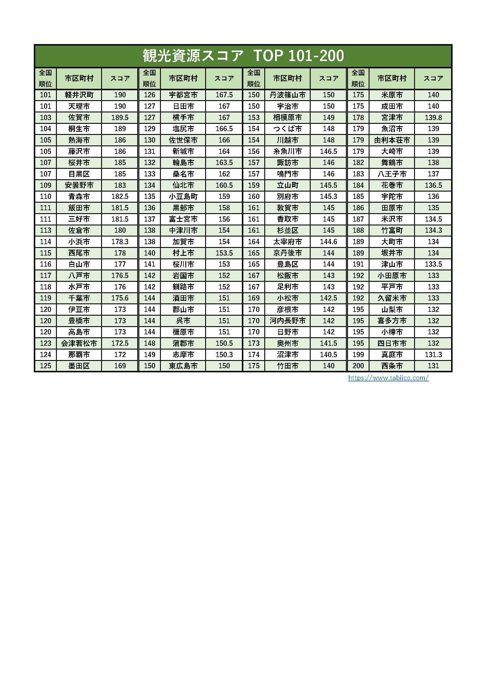 観光資源スコアTOP101-200 拡大はこちら : https://www.tabiico.com/tabiicotop200/