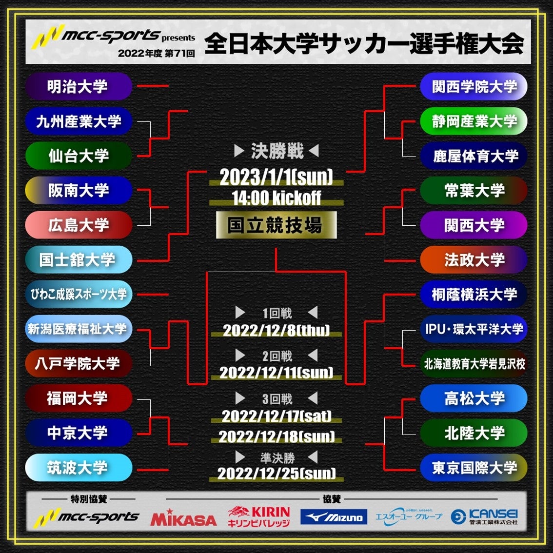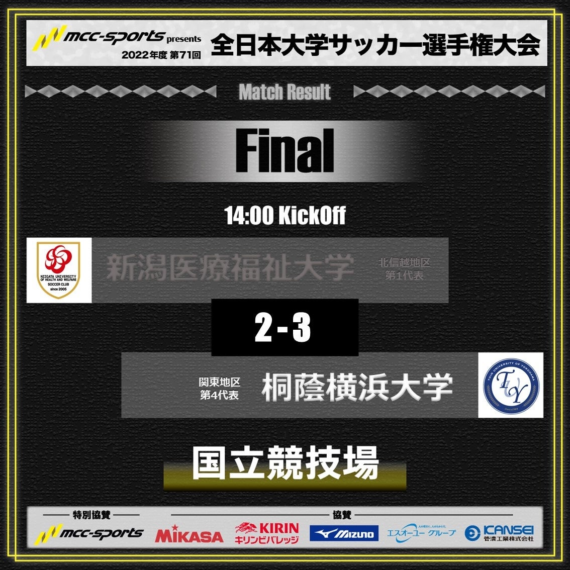 大学サッカーの日本一を決める『MCCスポーツpresents 2022年度 第71回 全日本大学サッカー選手権大会』は2023年1月1日に国立競技場で決勝戦が行われた。どちらが勝っても初優勝となる対戦カード。初優勝は、北信越勢として初めて決勝の舞台に立った新潟医療福祉大学か、それとも2度目の決勝で悲願の優勝を狙う桐蔭横浜大学か――。