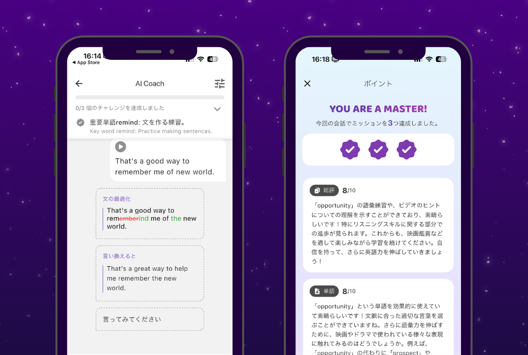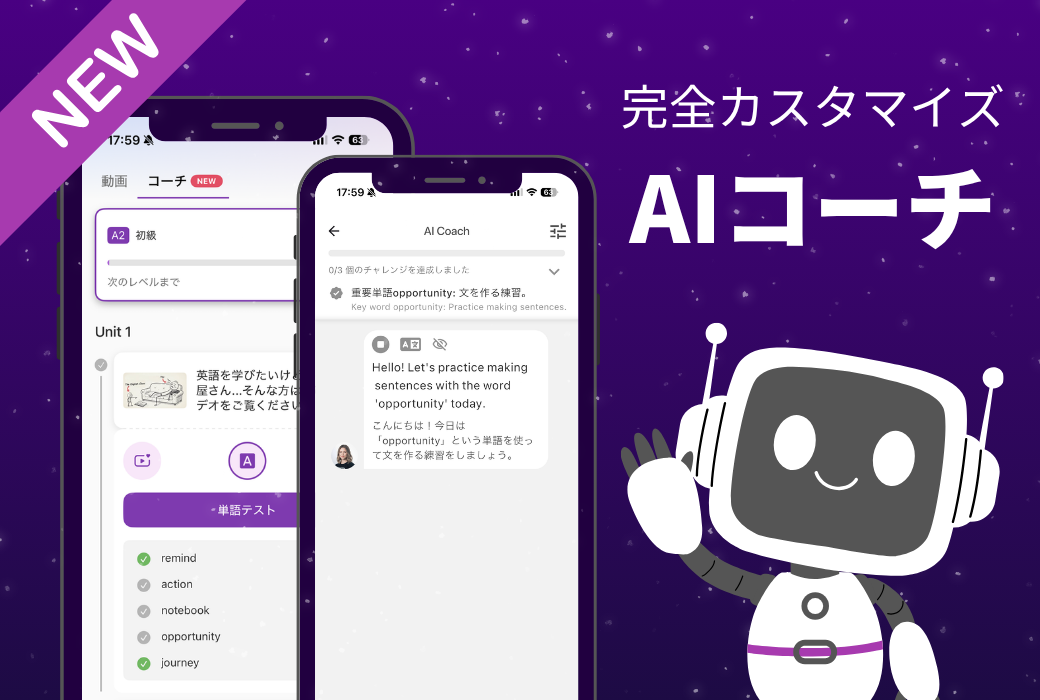 能「AIコーチ」および「AIチャット」をリリースいたしました。本アップグレードにより、英語学習の
