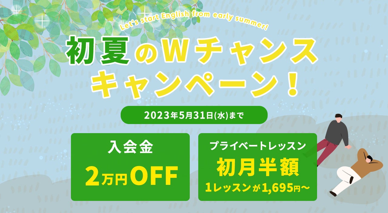 現在、ワンコイングリッシュでは、お得に入会できる「初夏のWチャンスキャンペーン」を実施中です。この機会に諦めかけていた英会話、始めませんか?ぜひ体験レッスンへお越しください!