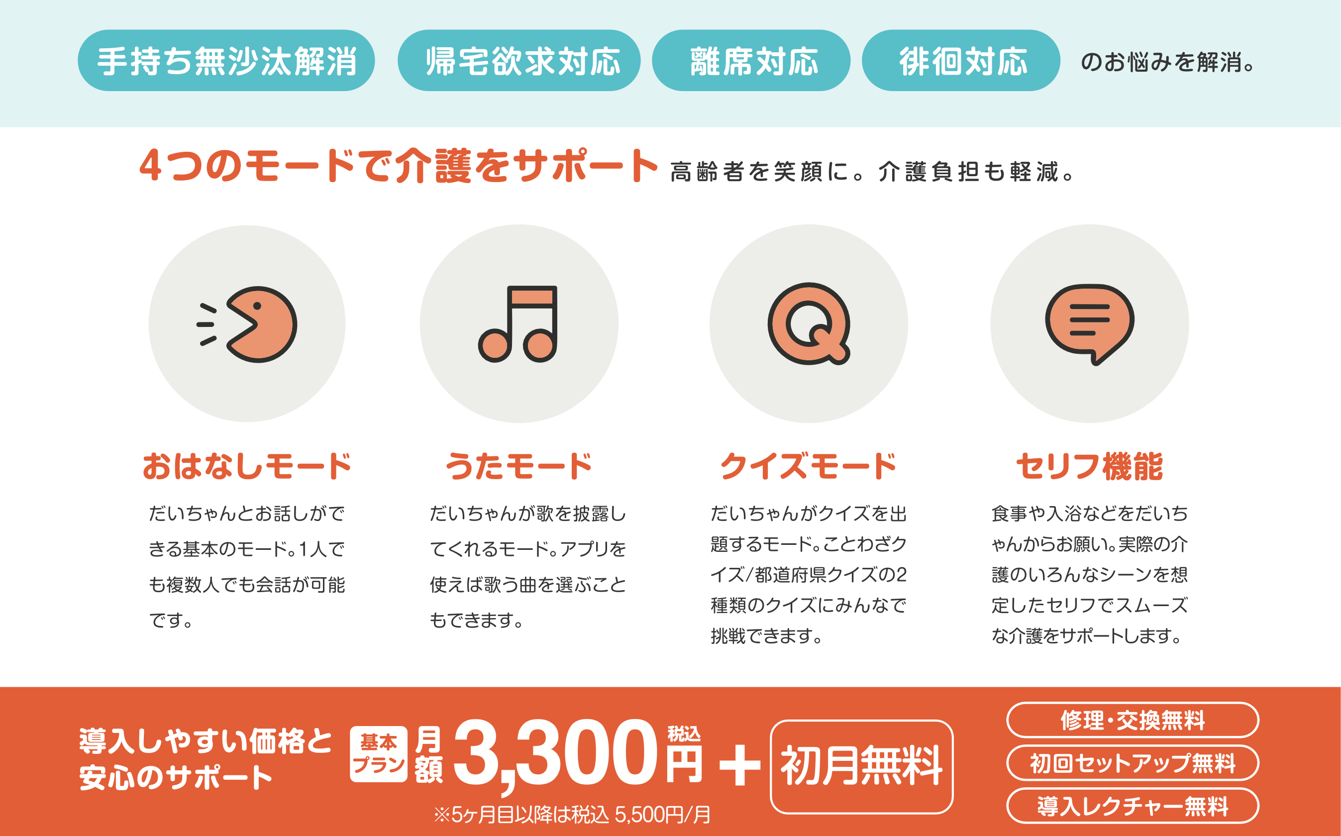 「おはなしモード」「うたモード」「クイズモード」「セリフ機能による介護誘導」の4つの機能で介護をサポート!