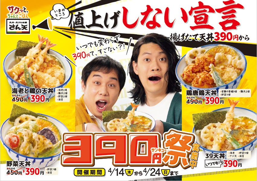 「値上げしない宣言!!」いつでも揚げたて天丼390円からの【天丼・天ぷら本舗 さん天】が4月14日(木)~4月24日(日)11日間≪天丼390円祭≫を開催!!