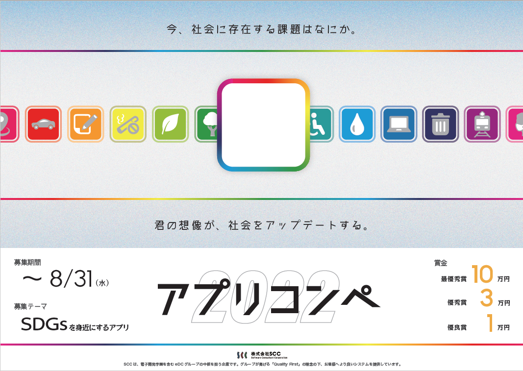 株式会社エスシーシー(本社:東京都中野区、代表取締役社長:松尾泰、通称:株式会社SCC)は、2022年11月17日(木)、同じeDCグループで全国に10校の専門学校を有する電子開発学園(学園本部:東京都中野区、理事長:松尾泰)の学生を対象とした、スマホアプリのアイディアを競うコンテスト「アプリコンペ2022」最終審査会を開催しました。本コンテストは2回目の開催となり、今年度は「SDGsを身近にするアプリ」をテーマにアイディアを募集。136件もの応募が集まりました。