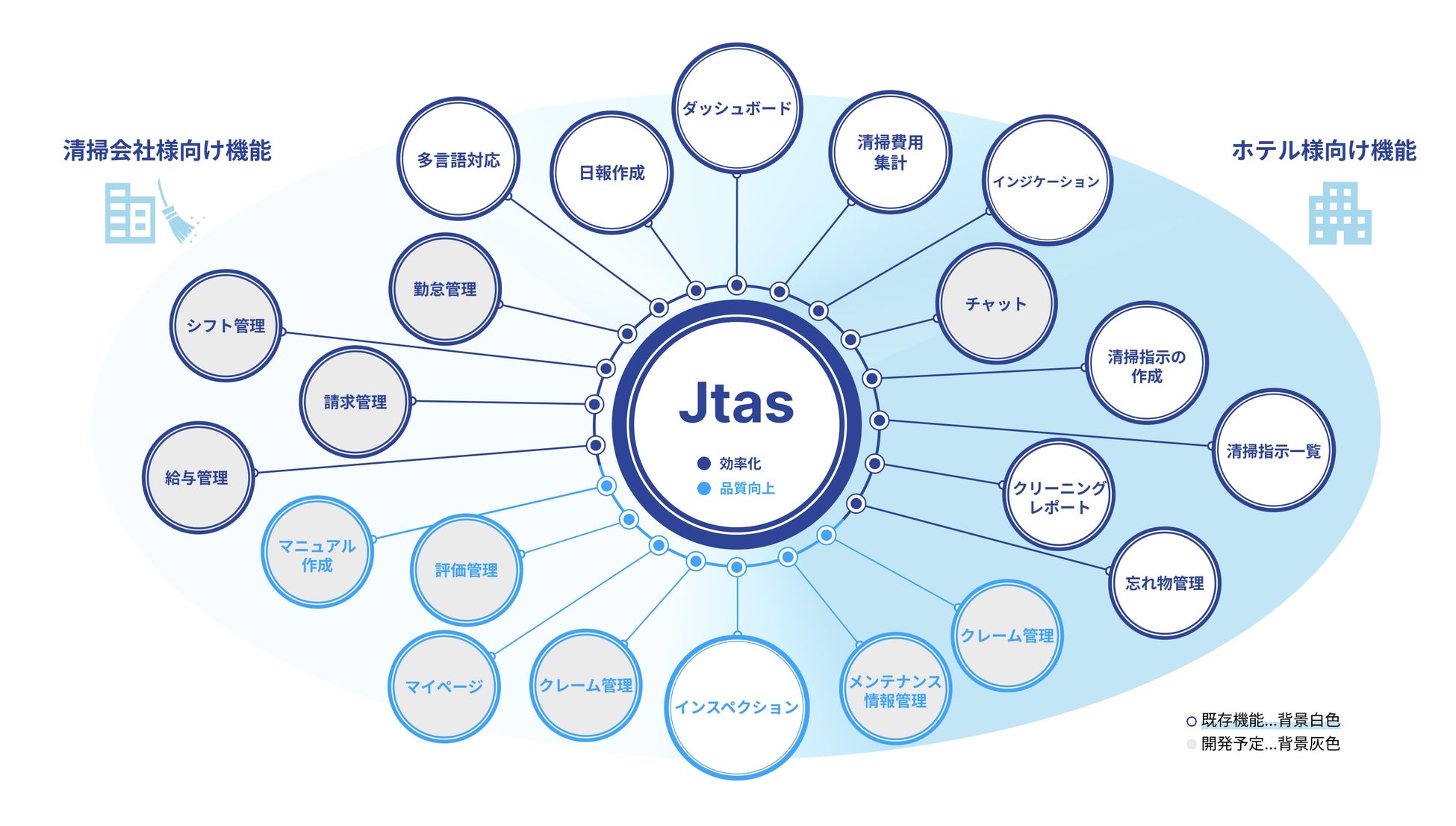 「ホテルの新たなインフラをともに創る」をコーポレートミッションに、テクノロジーを用いてホテル客室清掃領域の生産性と労働環境を向上し、日本が世界に誇れる清掃サービスの発展と従事する方々の地位向上を目指して事業展開する会社です。ホテル客室清掃管理SaaS「Jtas-ジェイタス-」と、SaaSを活用した客室清掃サービスを提供しております。